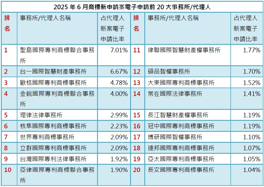本所2025年6月商標新申請案電子申請送件量在全國前20大事務所/代理人中達到第三名!