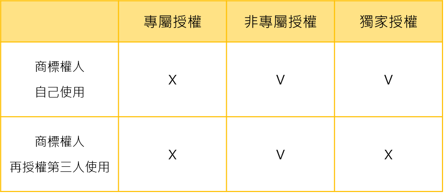 指在授權期間及範圍內,只有被授權人可以使用該商標,商標權人及第三人均不能使用,且商標權人也不能再授權其他人使用該商標。